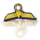 Eagle made of white matte silver-plated brass, the raised edges polished, slight approaches of patina, which looks very nice. Backside 3 soldered split pins, the wingspan is about 10cm. The naval eagle for teams is only for comparison of sizes and is not part of the offer.