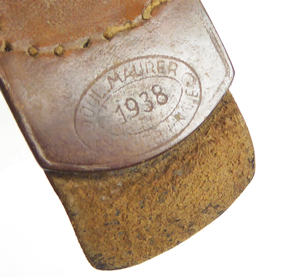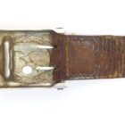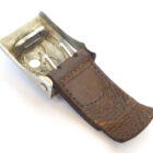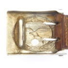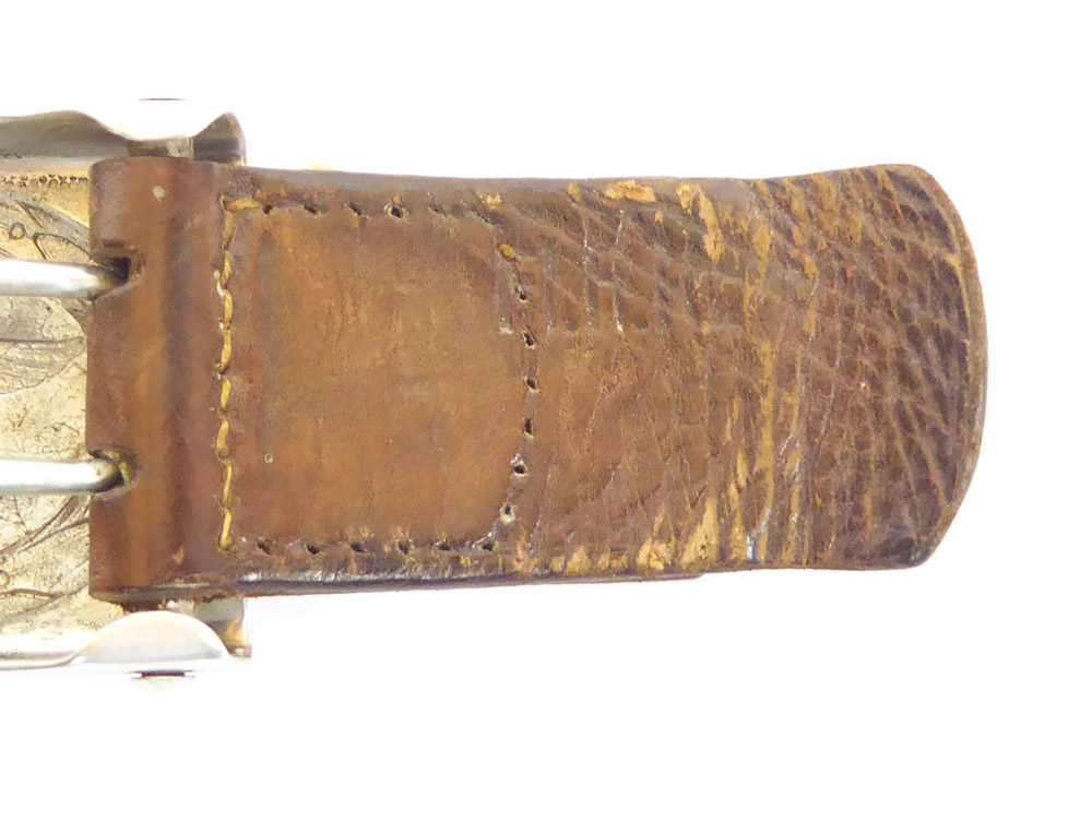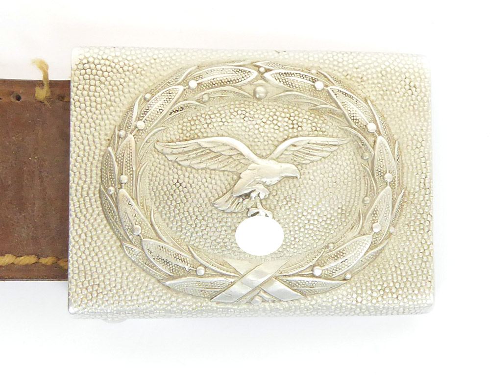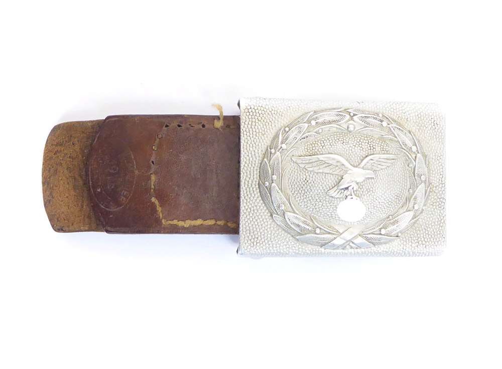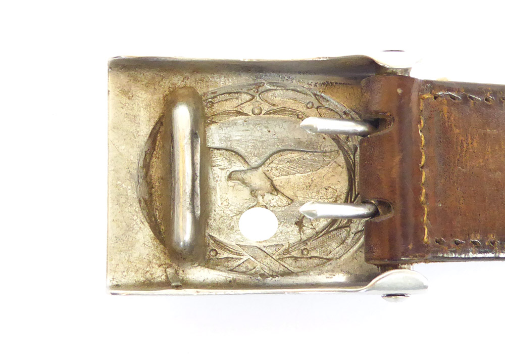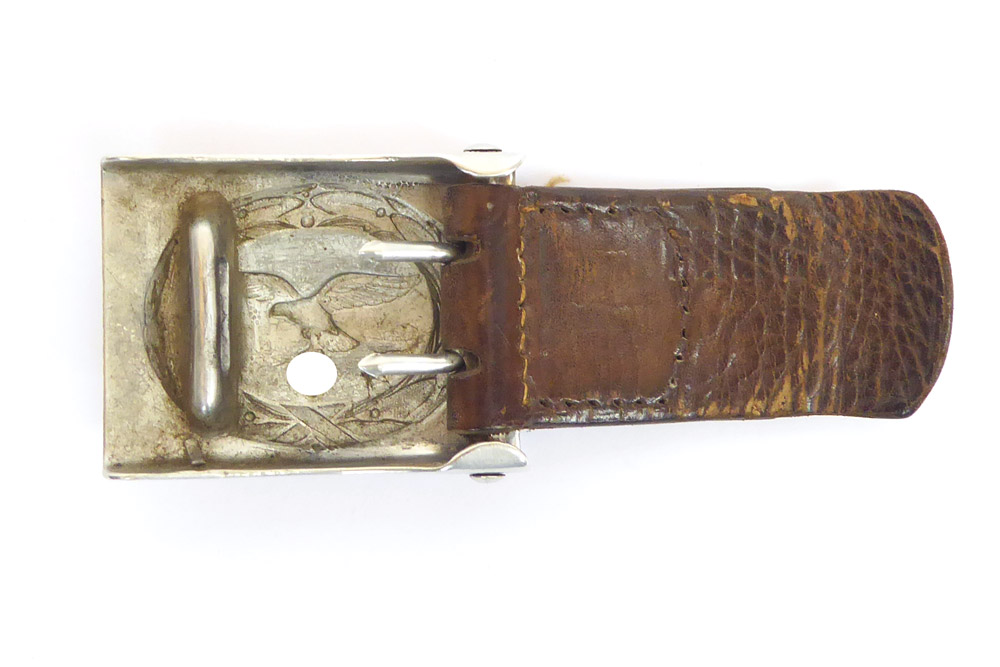 Early Luftwaffe aluminum belt buckle with leather tab, very nice, only very lightly worn condition, as pictured, with some stamps. Now difficult to find in this condition.