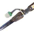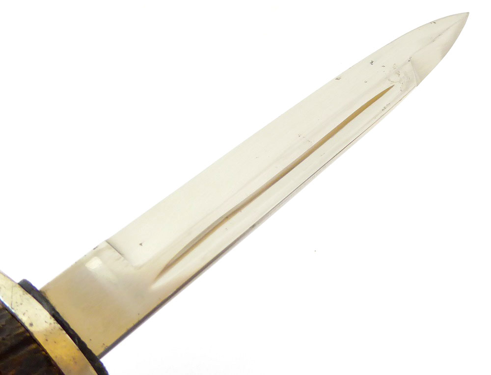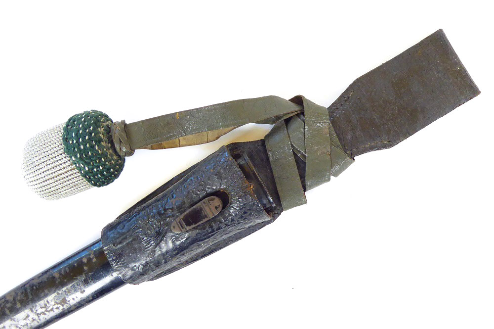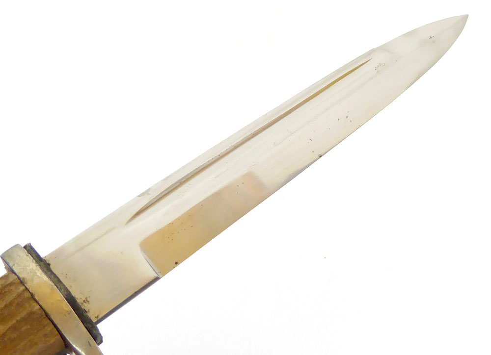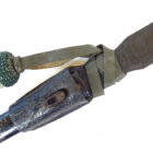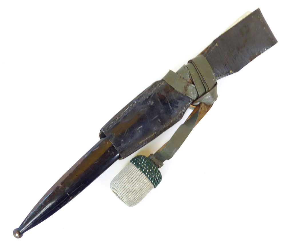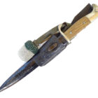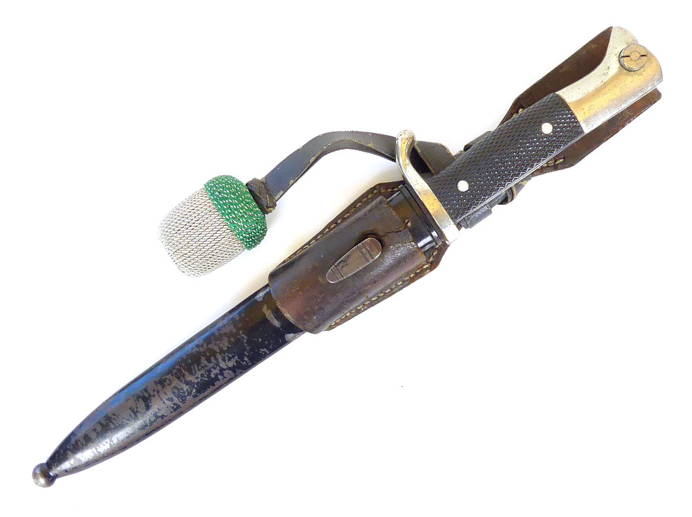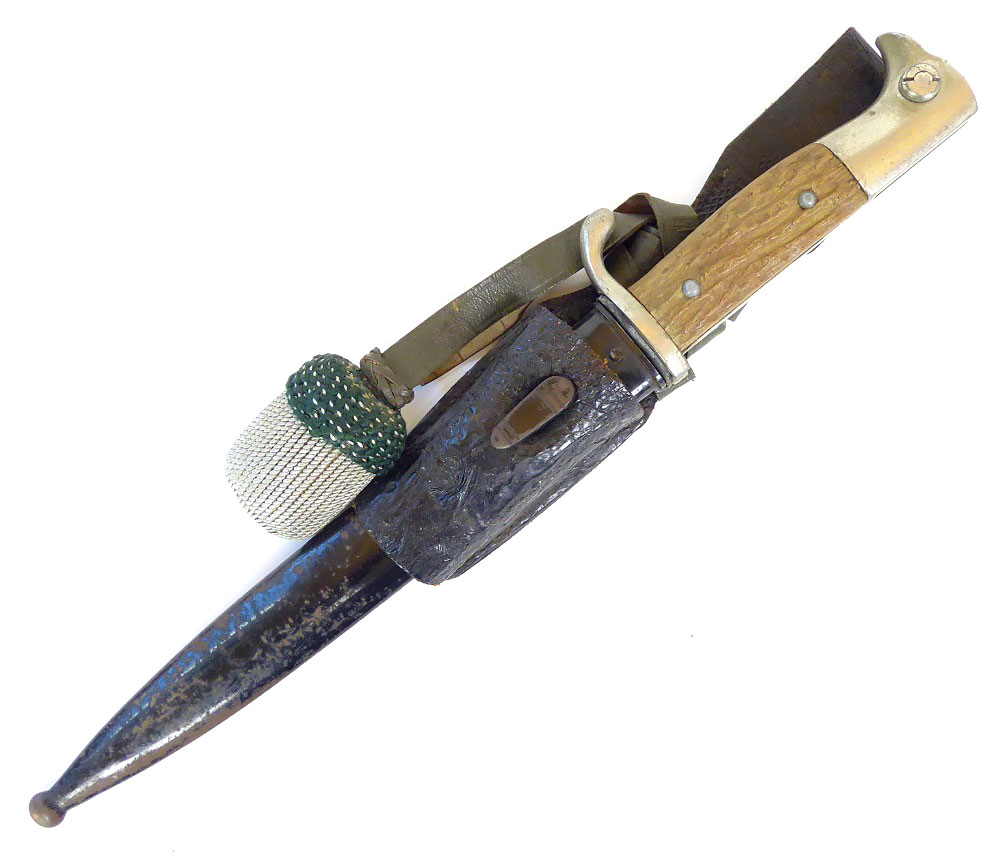 Extra side rifle (parade bayonet) of the Wehrmacht in very nice age-related condition. With a belt shoe and portepee, here as a special the handle scales in Deer horn imitation, i.e. carved wood with the look of Deer horn.