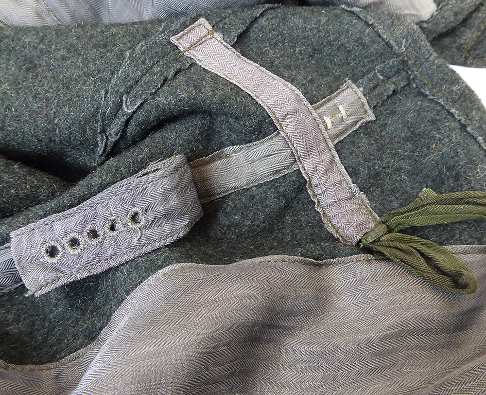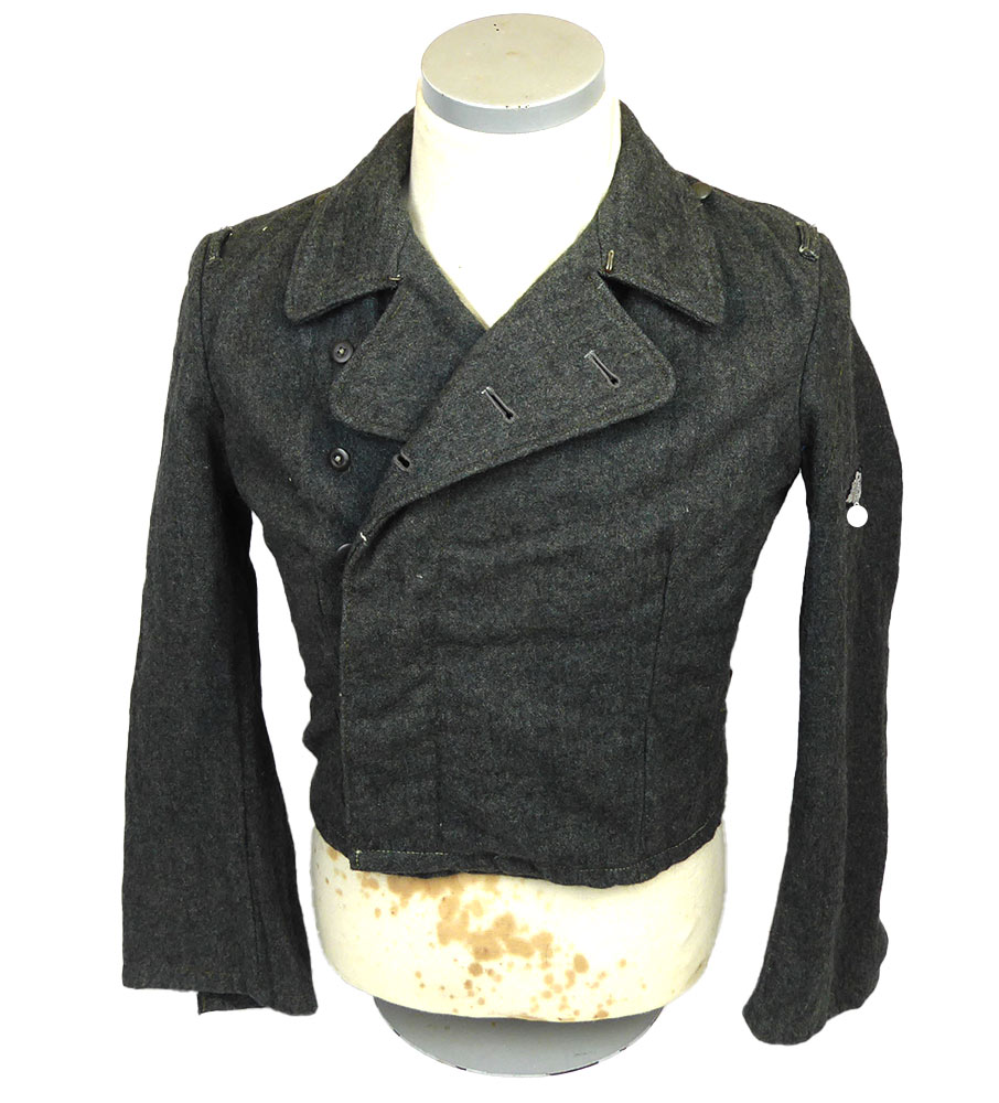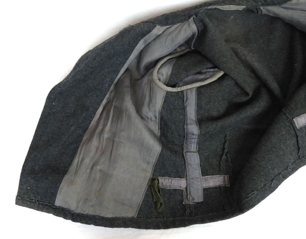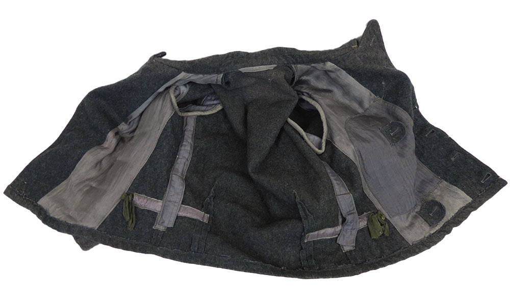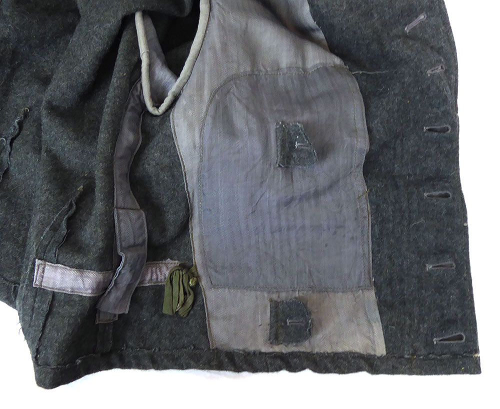 Fieldgrey Panzer Wrap for Sturmgeschütz of the Waffen-SS, i.e. the field-grey special clothing for Panzerkampfwagen. Beautiful, lightly worn condition, the sleeve eagle is still originally sewn, the collar tabs are unfortunately missing, there are no epaulettes either. This is a late production from mostly Italian captured materials, various different materials were also used in the lining, as is usual with the late Uniforms. Relatively small size, just about fits on the torso for photographing. Good condition, only lightly worn, hard to find in this quality.