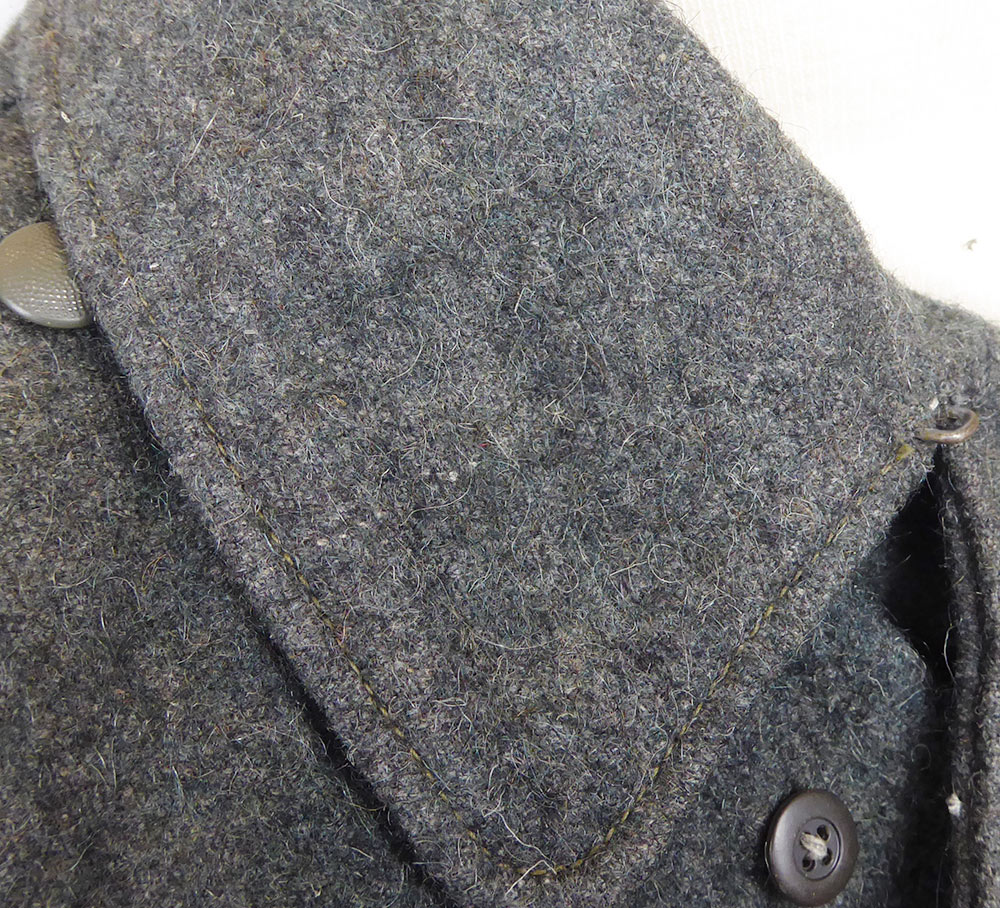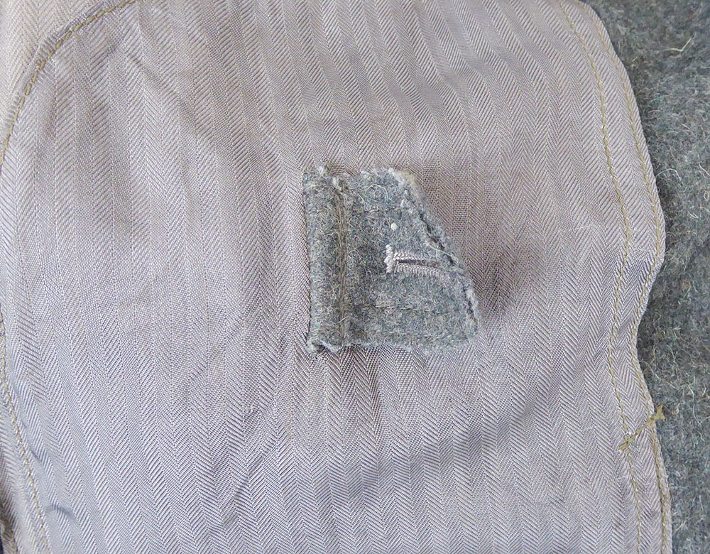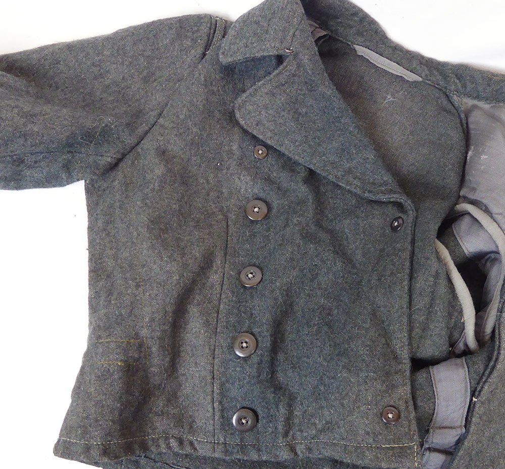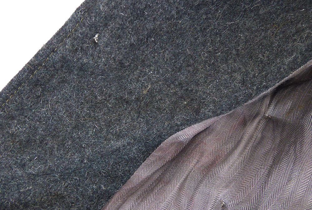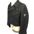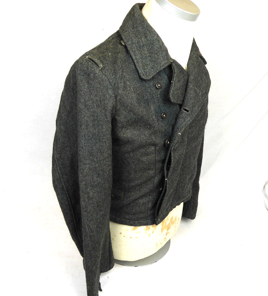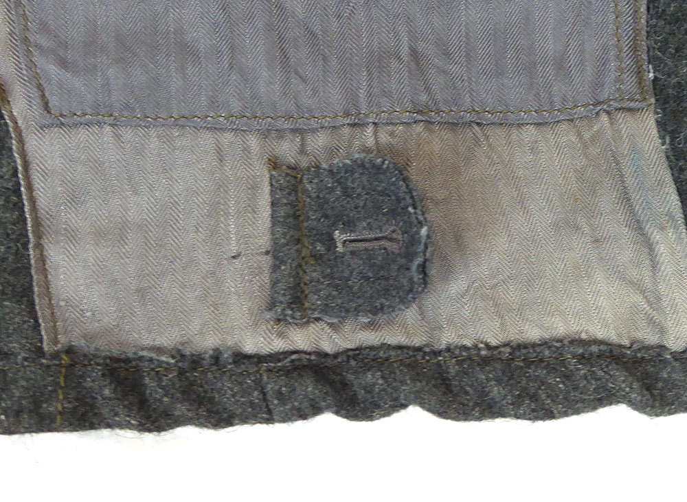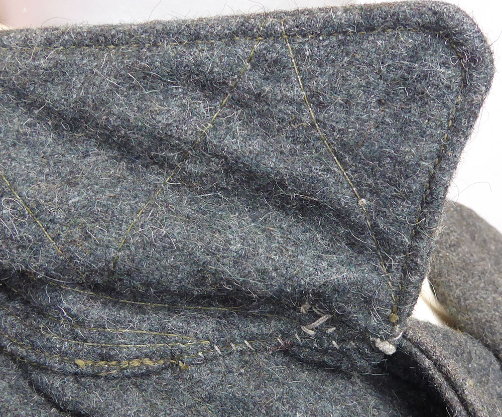 Sturmgeschützjacke der Waffen-SS, also die feldgrau Sonderbekleidung für Panzerkampfwagen. Schöner leicht getragener Zustand, der Ärmeladler noch original Vernäht, die Kragenspiegel fehlen leider, Schulterklappen sind auch keine vorhanden. Es handelt sich hierbei um eine Späte Fertigung aus zumeist Italienischen Beute Materialien, im Innenfutter wurden auch diverse verschiedene verwendet, wie üblich bei den Späten Jacken. Relativ kleine Größe, passt gerade so auf den Torso zum Fotografieren. Guter nur leicht getragener Zustand, schwer zu finden in dieser Qualität.