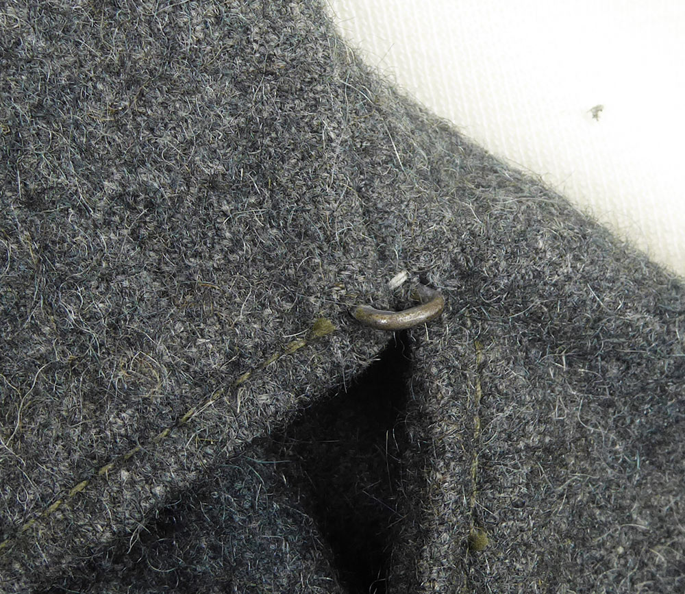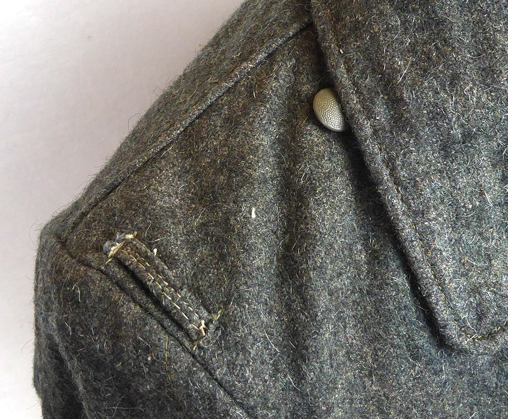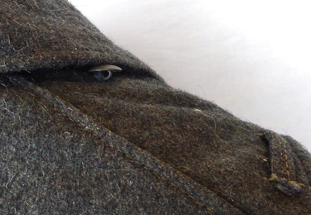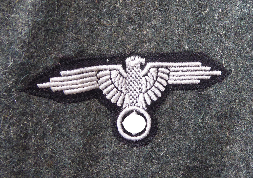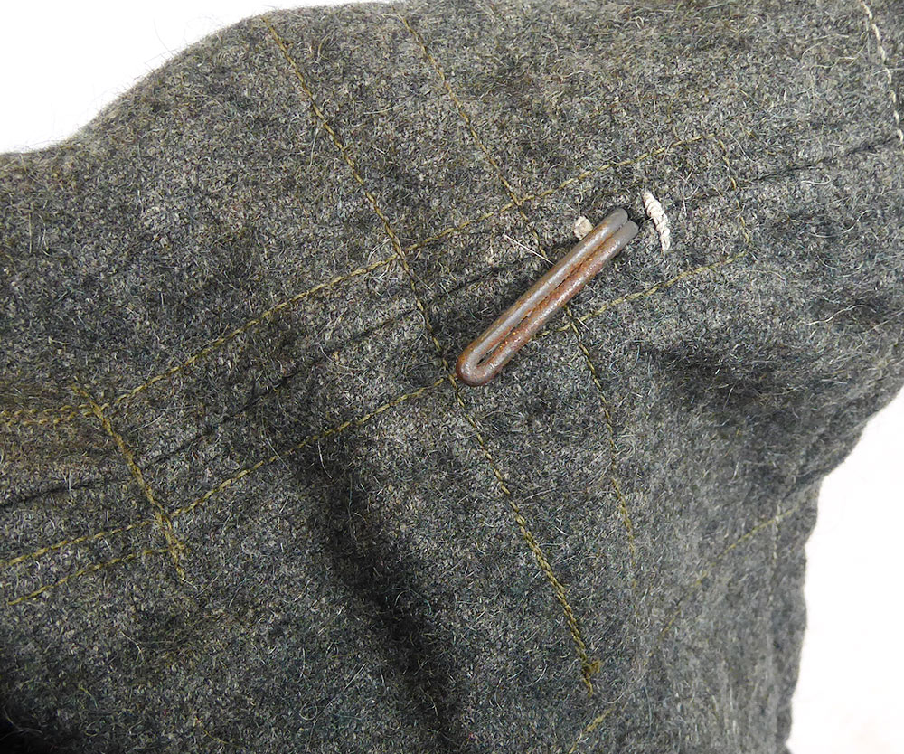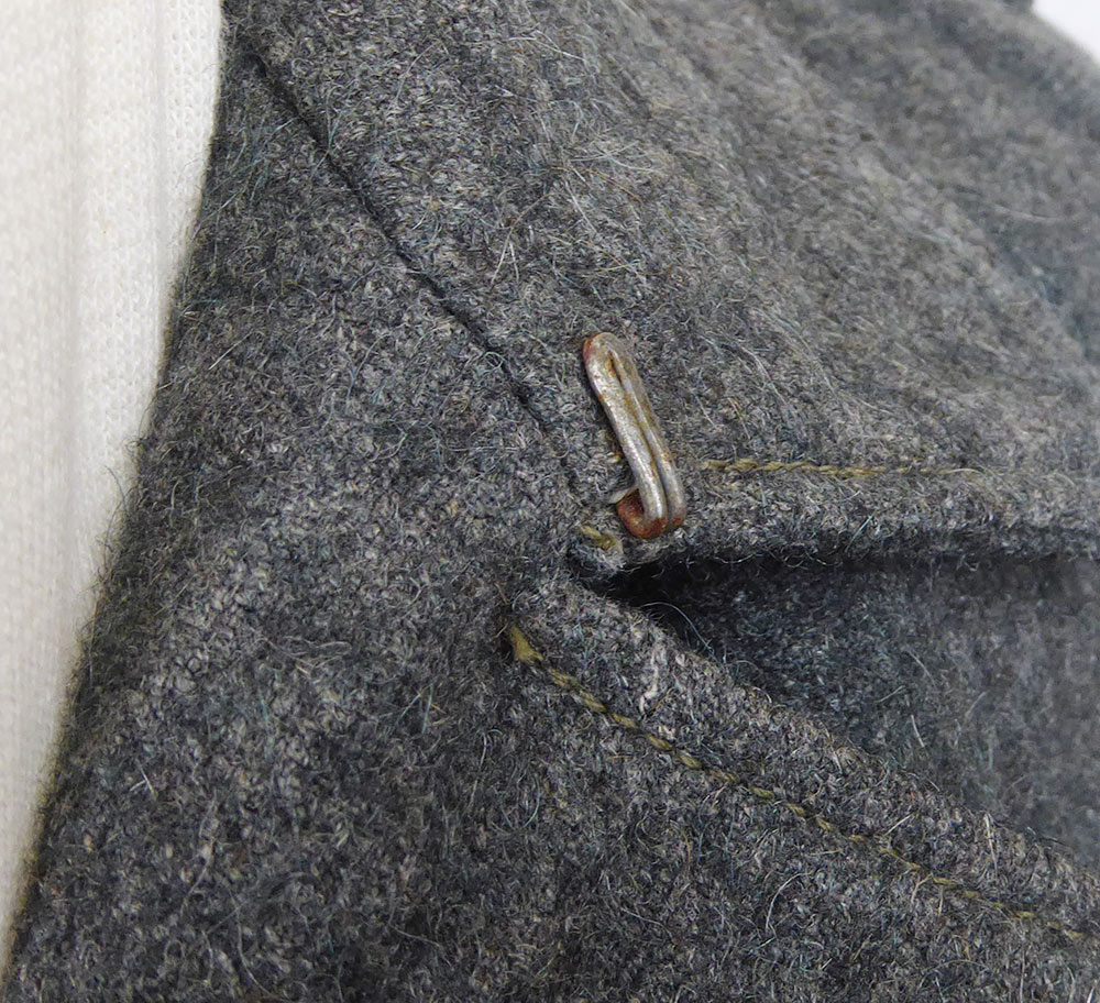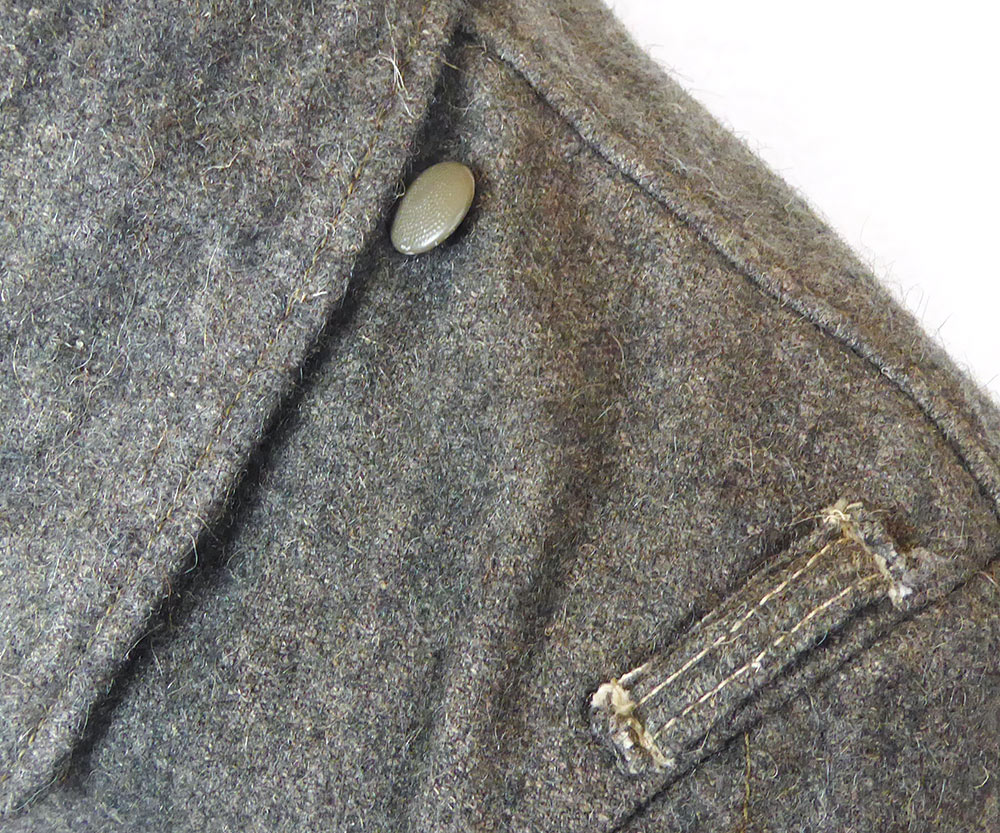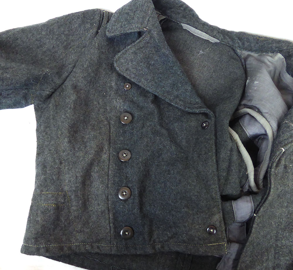 Sturmgeschützjacke der Waffen-SS, also die feldgrau Sonderbekleidung für Panzerkampfwagen. Schöner leicht getragener Zustand, der Ärmeladler noch original Vernäht, die Kragenspiegel fehlen leider, Schulterklappen sind auch keine vorhanden. Es handelt sich hierbei um eine Späte Fertigung aus zumeist Italienischen Beute Materialien, im Innenfutter wurden auch diverse verschiedene verwendet, wie üblich bei den Späten Jacken. Relativ kleine Größe, passt gerade so auf den Torso zum Fotografieren. Guter nur leicht getragener Zustand, schwer zu finden in dieser Qualität.