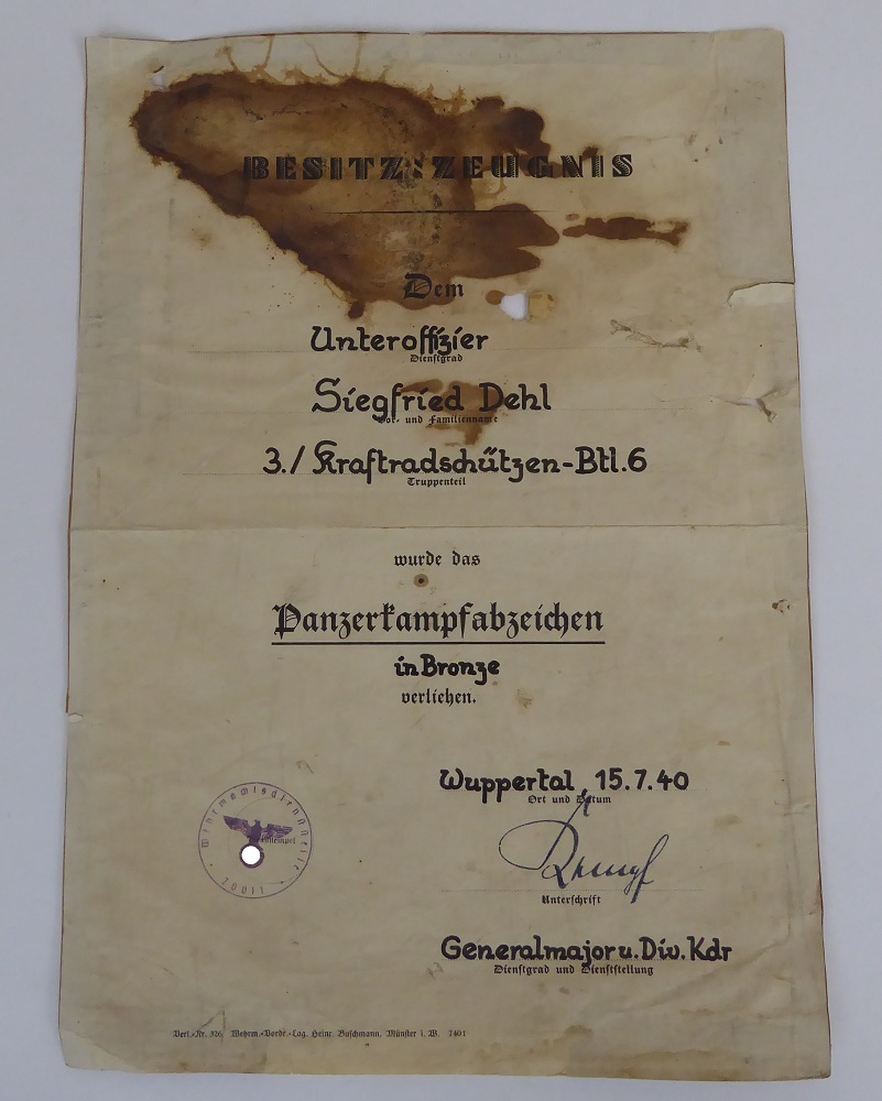 Urkunde zum Panzerkampfabzeichen in Bronze, für einen Kradschützen. Din A4 Groß, altersbedingter Zustand, etwas stärker fleckig, dafür selten.