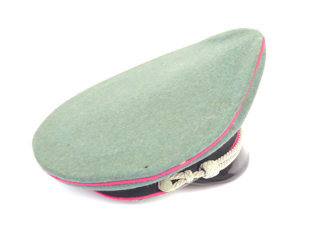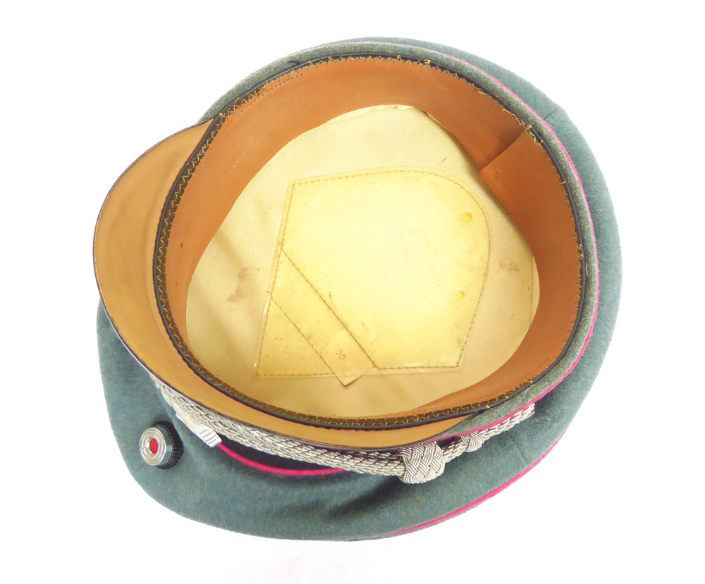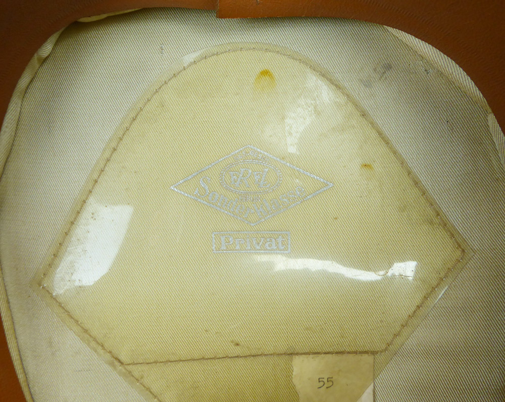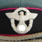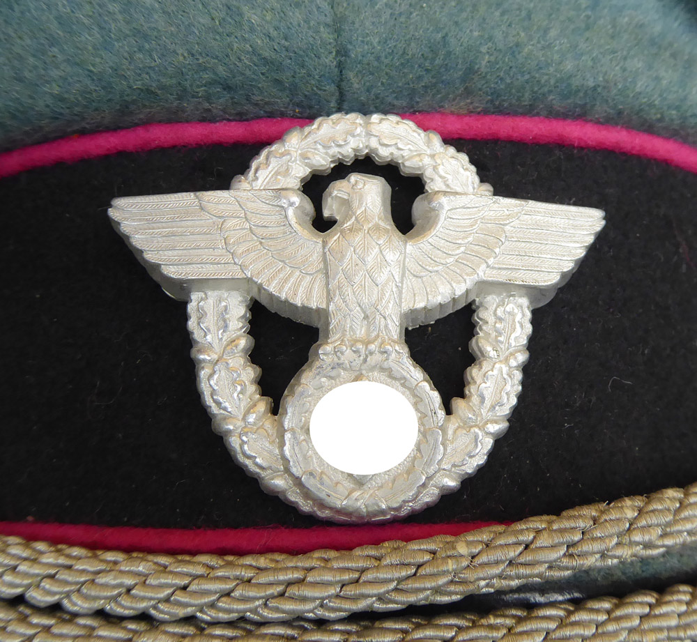 Schirmmütze für einen Offizier in der Kommunalpolizei (Gemeindepolizei) hier gefertigt von Erel im Modell privat mit Belüftungsloch unter der Kokarde, die Kokarde selbst aber ohne das Belüftungssieb. Insgesamt sehr guter nur leicht getragener zustand, hat nur minimale kaum auffallende Mottenlöcher. Eine extrem seltene Mütze, die wir hier zum ersten mal anbieten können und das sicherlich auch nicht so schnell wieder.