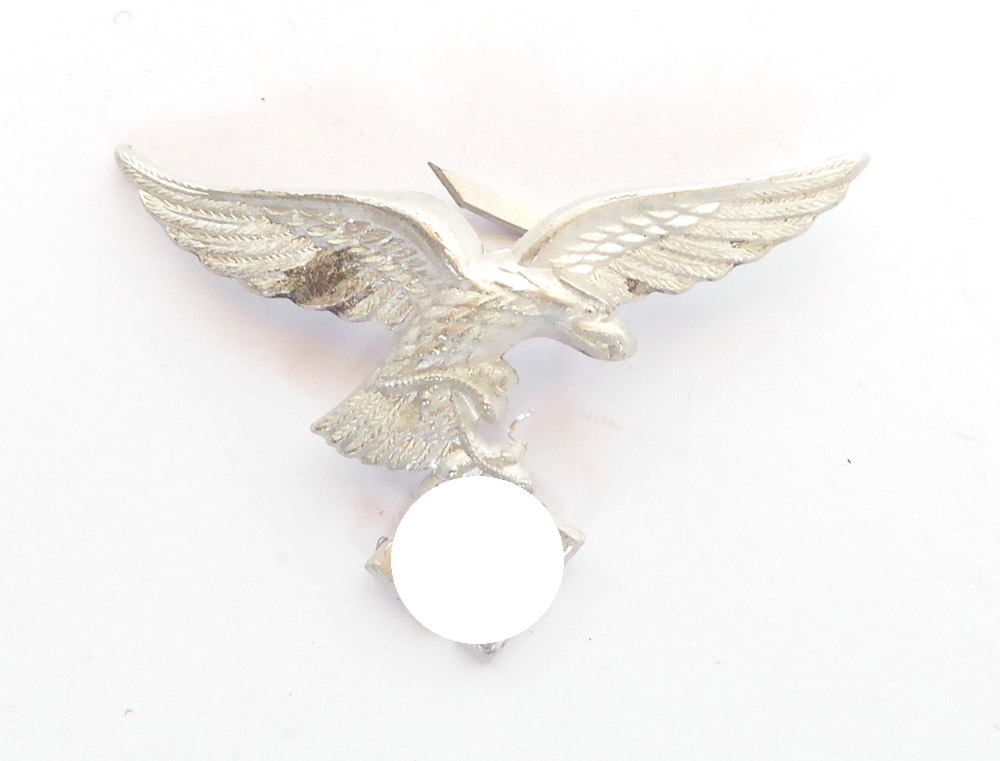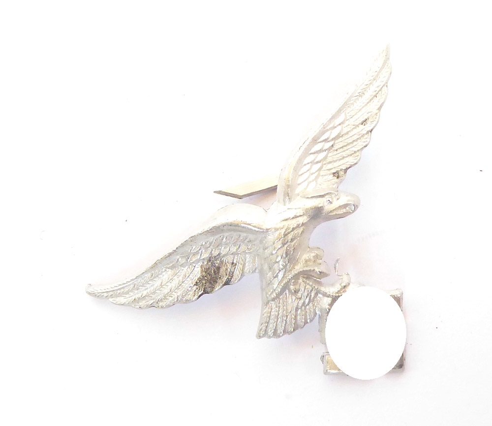 Visor cap eagle of the Luftwaffe, 1 model made of aluminum in very nice, only slightly worn condition, as pictured. One pin is still present.