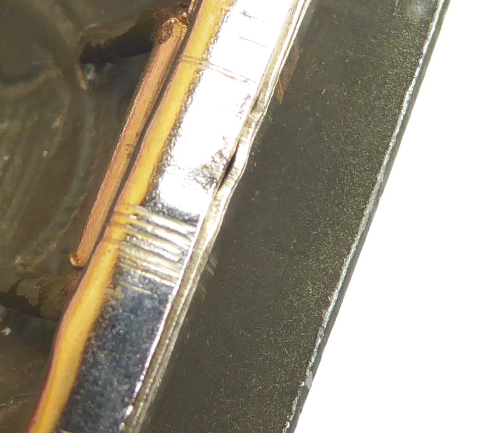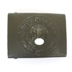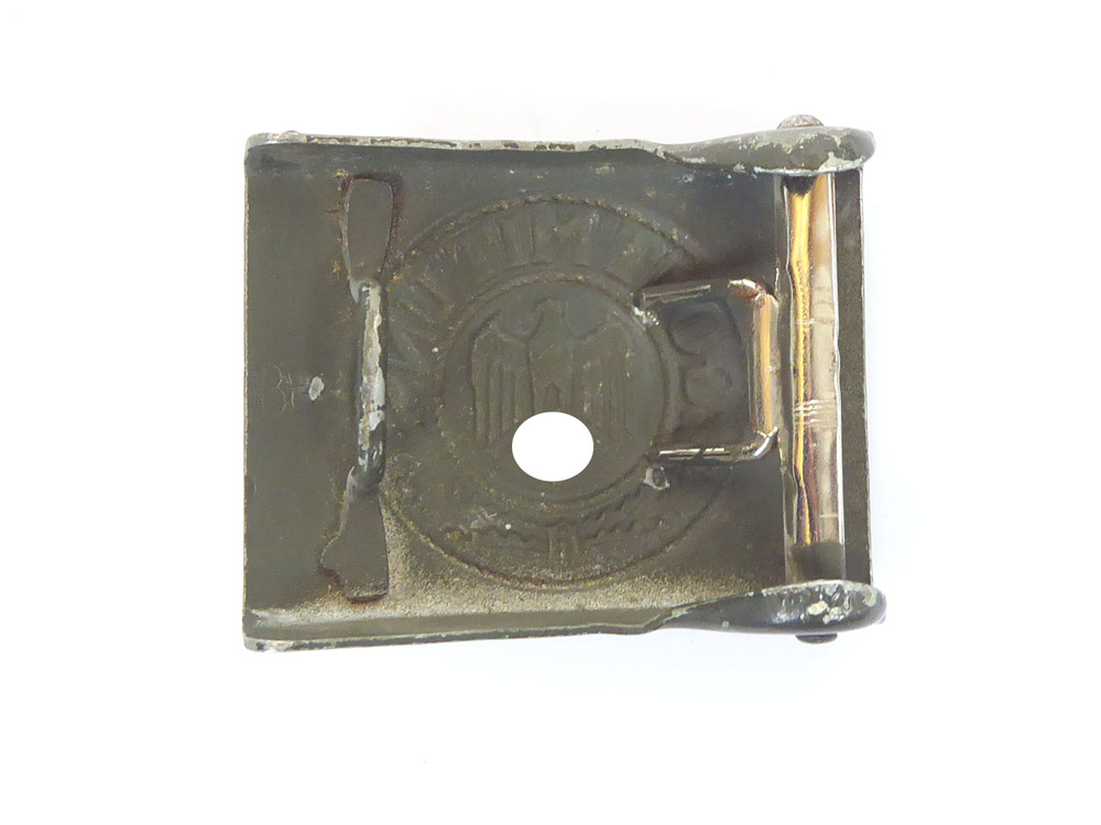 Wehrmacht belt buckle made of field grey painted iron, very nice, presumably unworn condition, stamped with GB and under the double prong with the year, but only a 4 is visible here.