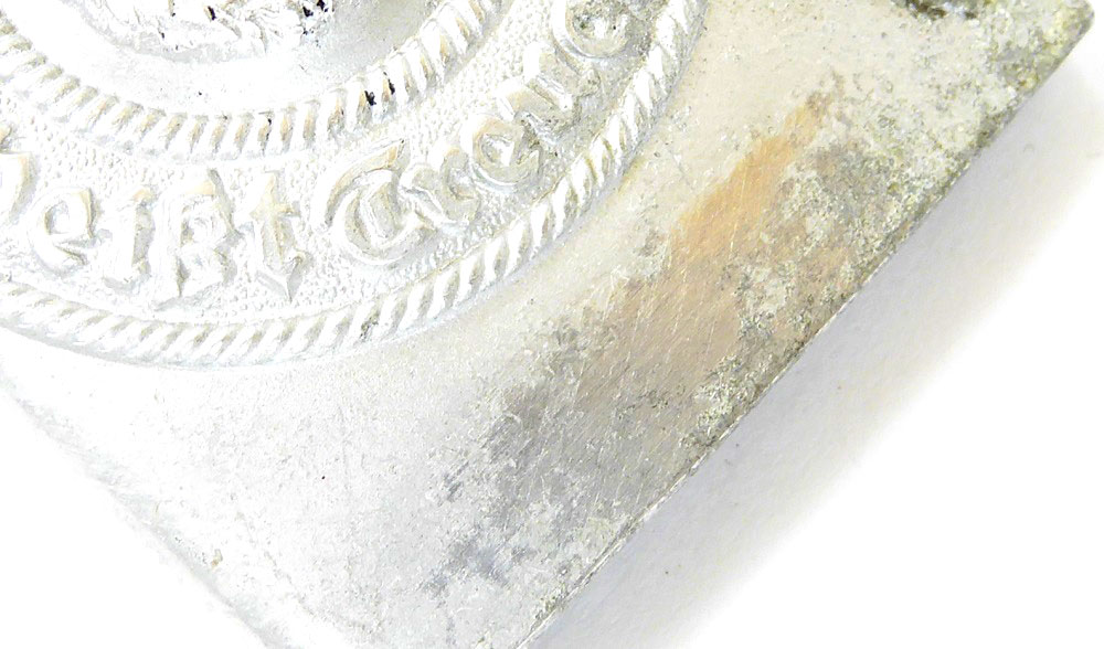 Aluminiumkoppelschloss der SS in getragenem Zustand. Dachbodenfund mit etwas Oxydation aber nichts Wildes. Rückseitig gestempelt mit RZM 822/37 SS.