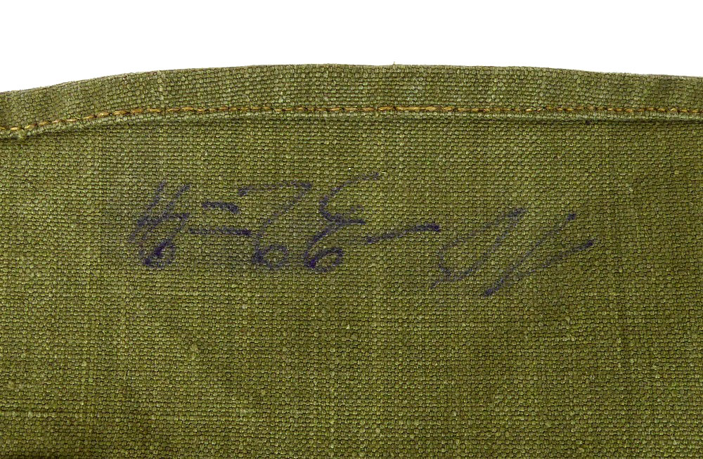 Brotbeutel der Wehrmacht in nahezu neuwertigem Zustand, mit diesem Haken zum Einhängen in das Koppel habe ich es noch nie gesehen, interessante Ausführung. Es wurde in den Deckel eine Zahlenkombination geschrieben, ansonsten neuwertiges Stück.