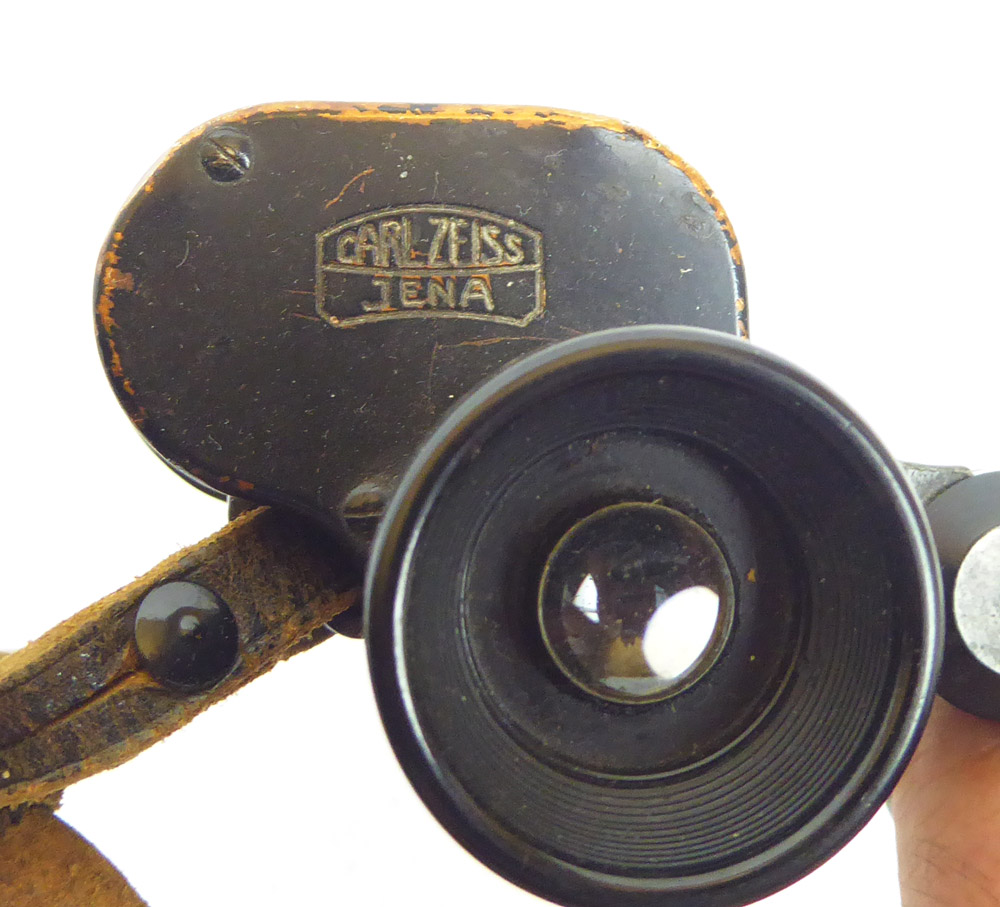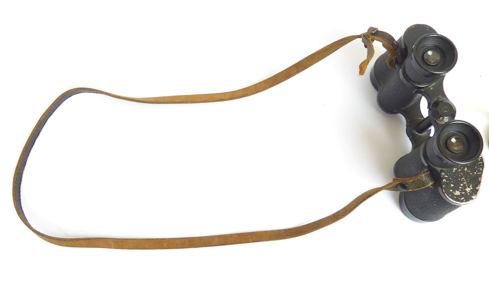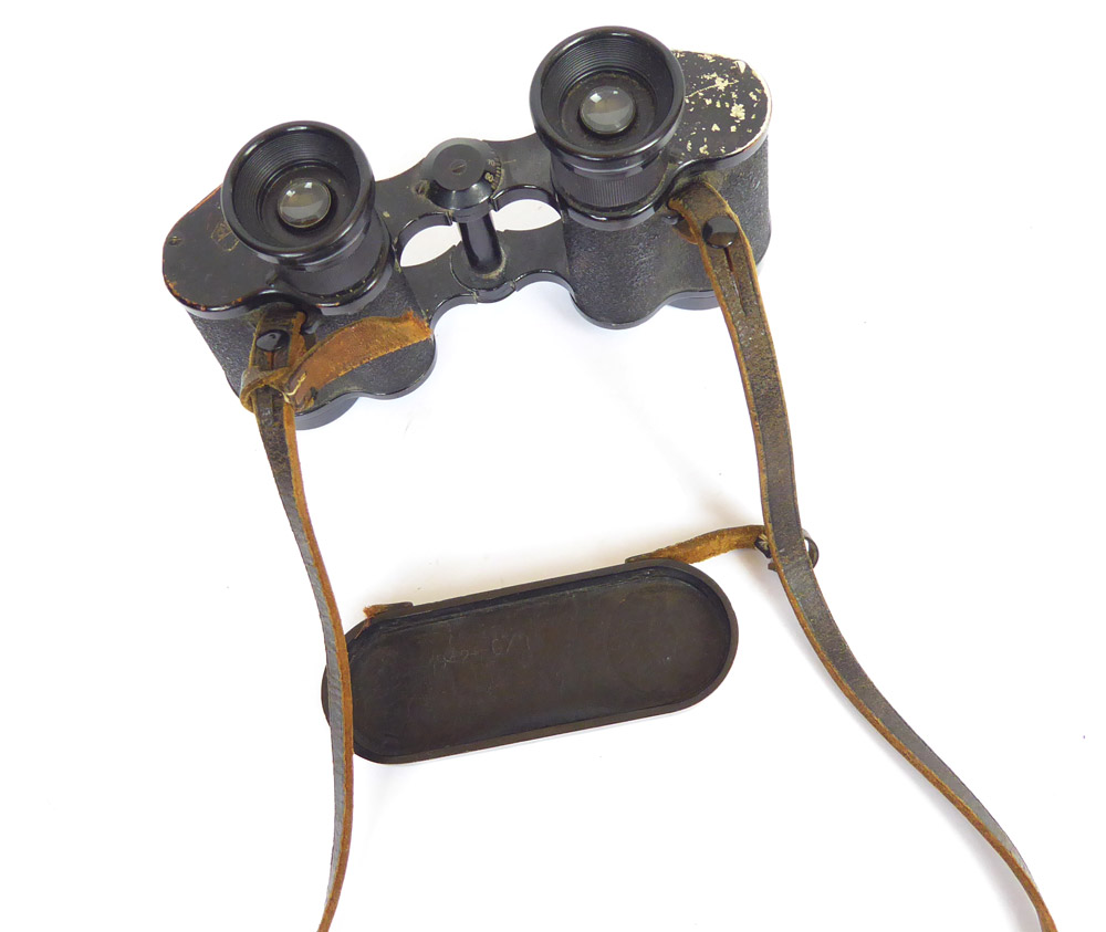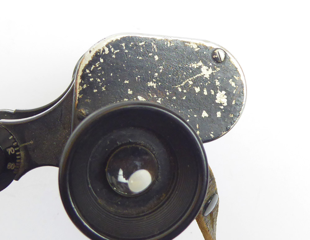 Dienstglas 6×30 mit Benutzerkappe und Trageriemen, die Durchsicht ist Klar und gut, Strichplatte vorhanden, gefertigt von Carl Zeiss Jena. Benutzerkappe mit cnx 1942 und WaA gestempelt, leider sind die beiden haltelaschen etwas beschädigt. Der Tragriemen sehr schön mit ddx 1941 gestempelt.
