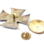 Iron Cross 1 class 1939 as one-piece construction with screw back from the manufacturer Juncker Berlin. Made of silver-plated brass, the background painted black, worn piece in very fine condition with a magnificent silver patina.