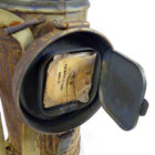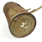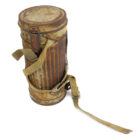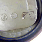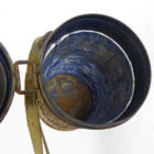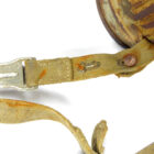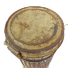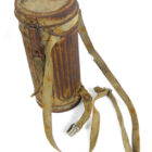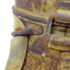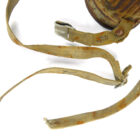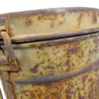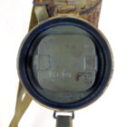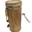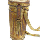 Gasmask Container of the Wehrmacht painted in TAN. Good condition, worn piece. Long and short strapping still available, also the spare lenses. Long belt torn. The can was filled with blue color powder, but was removed, remains are still present.