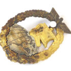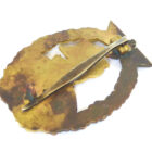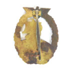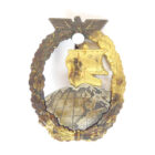 Auxiliary cruiser war badge of the Kriegsmarine, early production made of tombac in only slightly worn condition, the radiant gold plating has been partly completely preserved, with a wonderful patina, just as found. Unmarked but a well-known variant from C.E. Juncker Berlin.