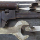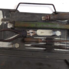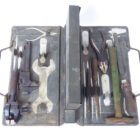 Kleiner Waffenmeister Behilfskasten, Faltbarerer Werkzeug Einsatz für den MG Gurtkasten. Hier in einem Panzer Grauem MG Patronenkasten 41 der Wehrmacht. Der Einsatz in gutem Zustand von ave 43 H und WaA gestempelt. Leicht staubig, die meisten Werkzeuge sind nicht die korrekten für diesen Einsatz, sieht aber optisch doch besser aus finde ich. Der Einsatz und der Gurtkasten selbst sind so jedoch 100% Originale. Mittlerweile sehr schwer zu finden.