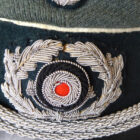 Leicht getragene Schirmmütze der Wehrmacht für Infanterie in sehr schönem Zustand. Es handelt sich hierbei um ein sehr frühes Stück für einen Offizier mit handgestickten Effekten, 2 Kleine Mottenlöcher Vorhanden.